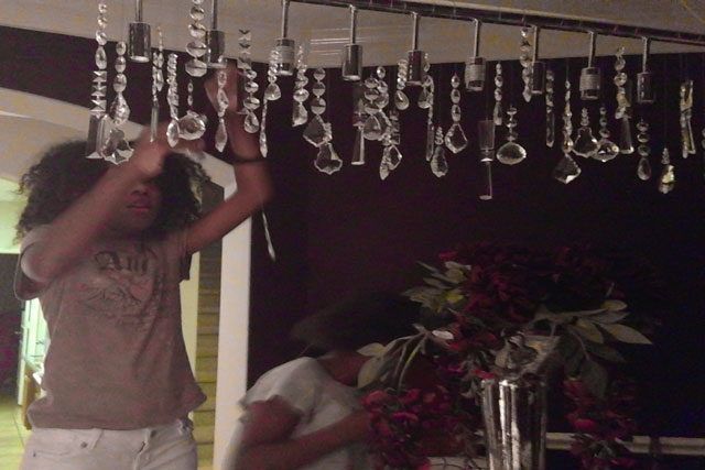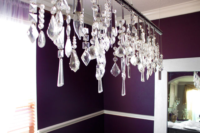 From there, I was tired of looking at the old light fixture, so I decided to replace it with this crystal chandelier found at ZGallerie. With the assistance of my lovely daughters, we managed to get it up in one piece. Well sorta.