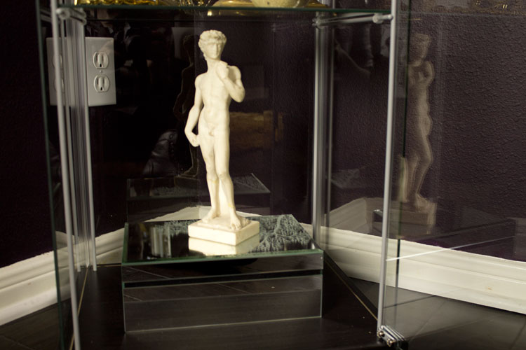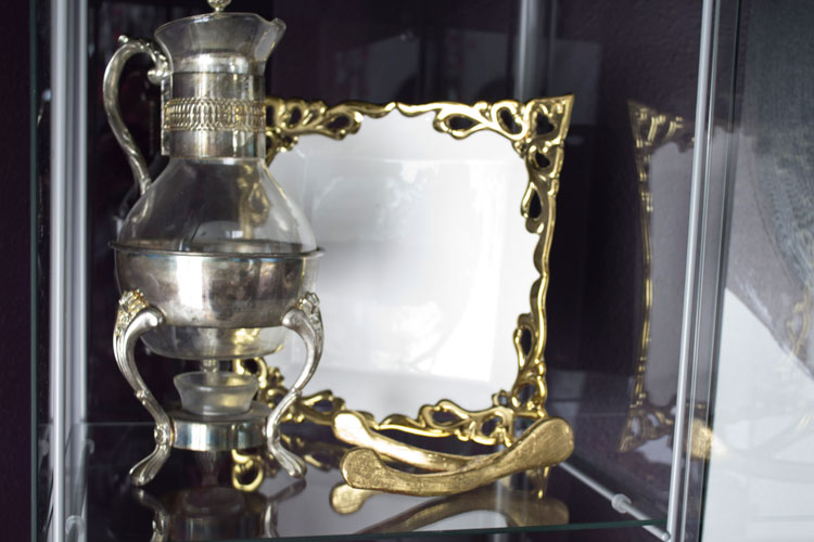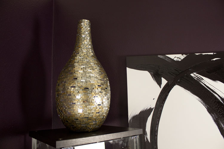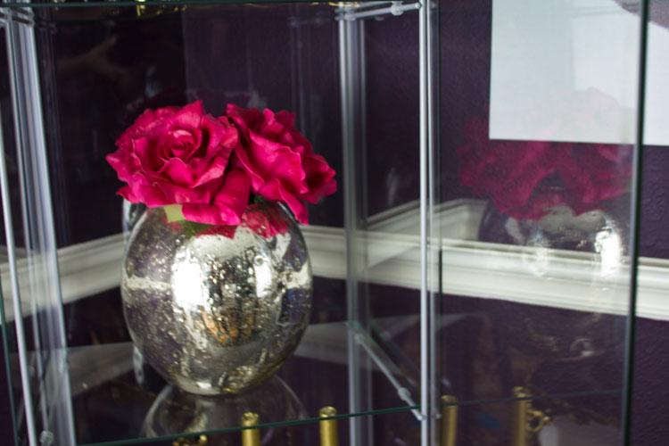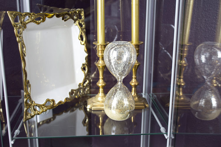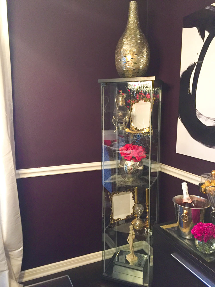 Next to the buffet, I have a glass curio stationed in the corner. This wall was really lacking something, and this curio was a perfect way to both fill the space and decorate the room. I’ve placed an over-sized vase at the top just to give the illusion of height.