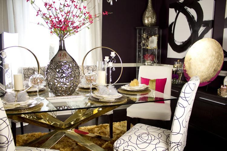 This dining room table is the epitome of glam. The gold finished metal base with the “starburst” legs and glass top paired with that gold fur rug screams Hollywood!!!