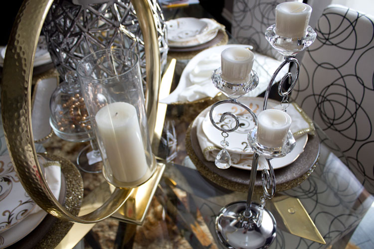 Here’s a side view. I made the gold leaf canvas art a while ago and they happen to fit perfectly there in the room. On the table I have two sets of candle holders, six place settings, two glass dome cupcake stands, and a few decorative dinner ware pieces.