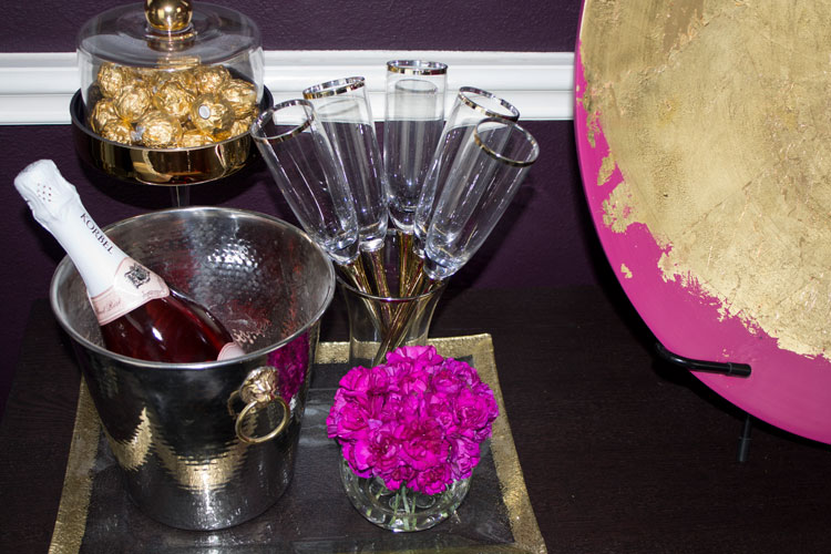 To the left of the buffet, I have this set up. The conversation piece would have to be the wine glasses. They don’t have a base! You can just fill them up right in the holder. Your guest will grab a full glass and return the empty glass to the same location. I know, AWESOME RIGHT?!! I added a pop of color with fresh flowers and a bottle of Korbel Champagne from the grocer. Like, what’s a setup like this without a bottle of bubbly. Really?!