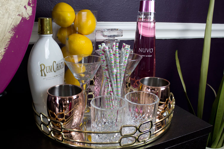 The right side of the buffet is my favorite side. It reminds me of all of the cute little pictures that you see and love on Pinterest with the straws and all. LOL. But really, my goal with this was to make it as pretty as possible with as little money as possible. And, I am happy to announce that it only cost me a tray, two martini glasses, and a bottle of Nuvo, which BTW I have no idea what it is but can’t wait to crack it open.