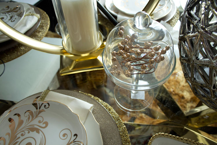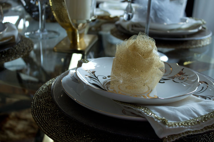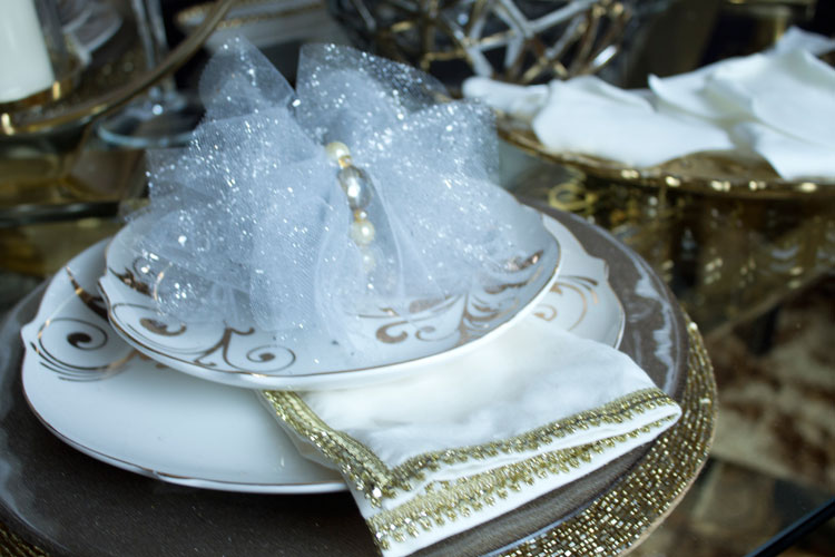 So for the place settings, I’m using a gold beaded place mat, a champagne colored sparkle charger, and a dining plate and saucer with gold scrolls. I topped four of the saucers with silver glitter tulle bow with glass beads.